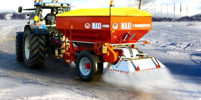 Разбрасыватели соли и песка модификации MAXI оснащены большим бункером, что обеспечивает высокую производительность, при ежедневной работе. Очень прочная несущая структура, позволяет достигать скорости 40 км/ч.  Распределительная группа состоит из двух разбрасывающих дисков с регулируемыми радиальными панелями из нержавеющей стали.  Дно бункера состоит из резиновой конвейерной ленты, которая обеспечивает равномерное распределение песка или соли, поскольку специальное приводное зубчатое колесо напрямую передает скорость движения от транспортного колеса.  Широкая опорная поверхность шин уменьшает давление на асфальт, в том числе при критических условиях.  Выпускается на одно и двухосных шасси.